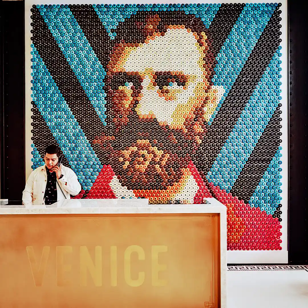 It’s a member of the Proper Hotels family, a group with some expertise in tailoring a boutique-hotel vision to its specific setting. Rooms are decorated in a number of distinct, creative styles, and every square inch of the place is a tribute to Venice’s artistic heritage, its surf and skate tradition, or both — the lobby is dominated by a mural depicting Venice’s founder, Abbott Kinney, made from some 4,000 skateboard wheels.